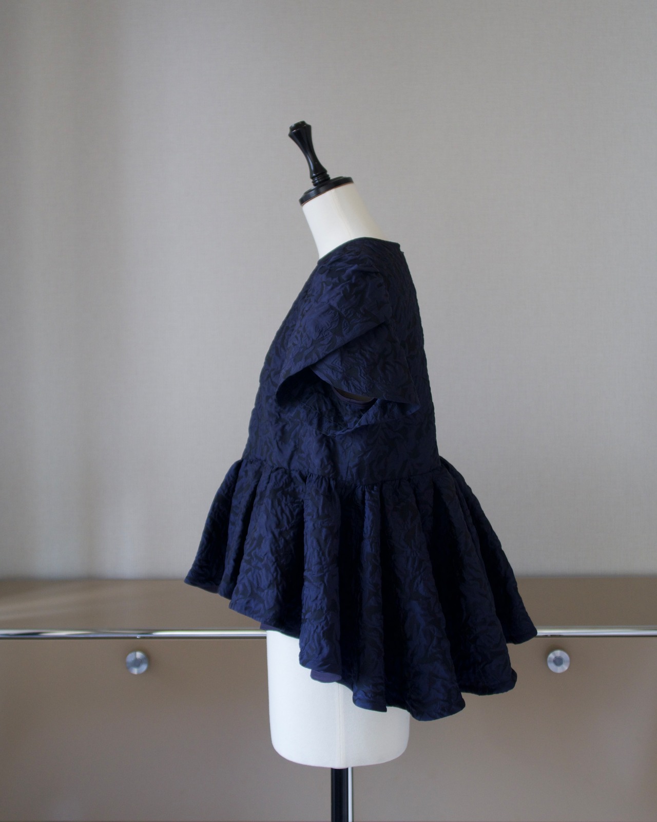 光沢感のあるジャガード素材をたっぷり使用して、お作りしたブラウスです。後ろ下りのデザインなので、前後でイメージがガラッと変わります。