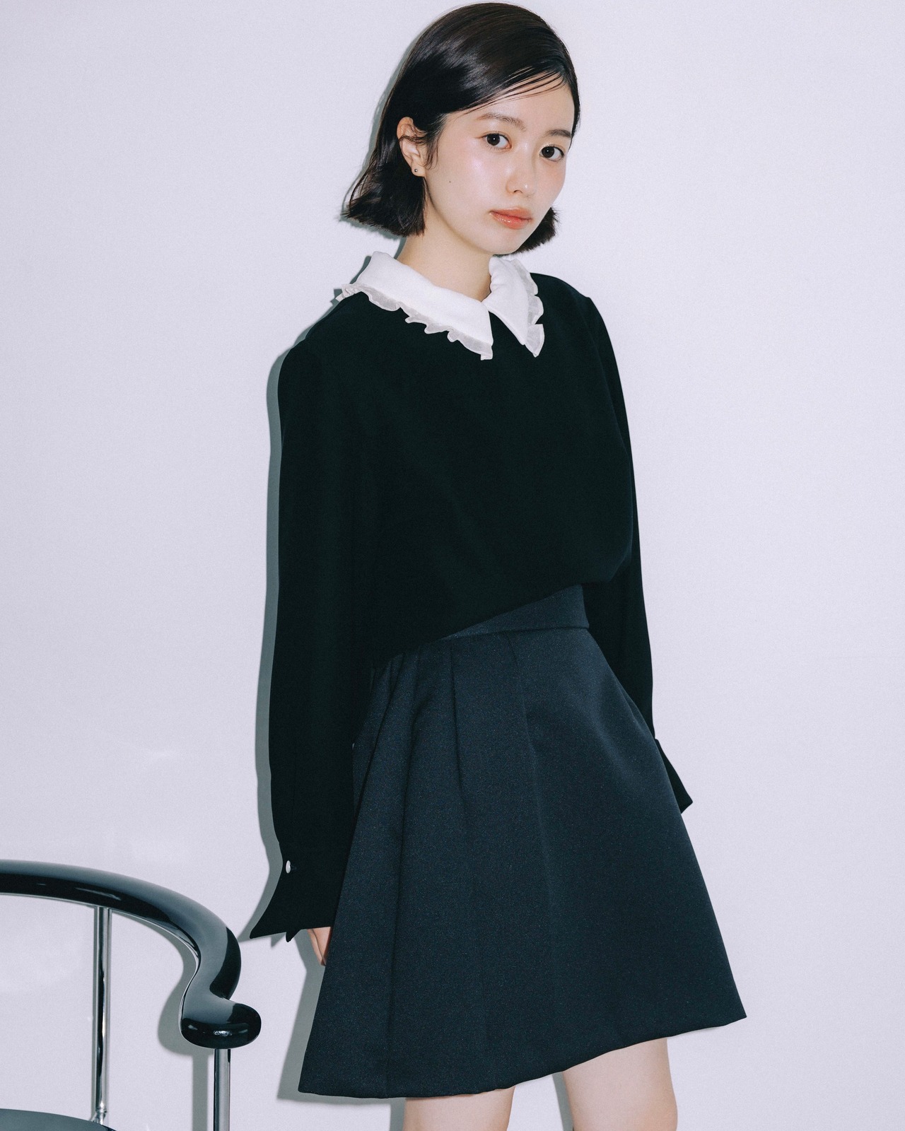 襟元にあしらわれた繊細なチュールが、顔周りを華やかに彩ります。