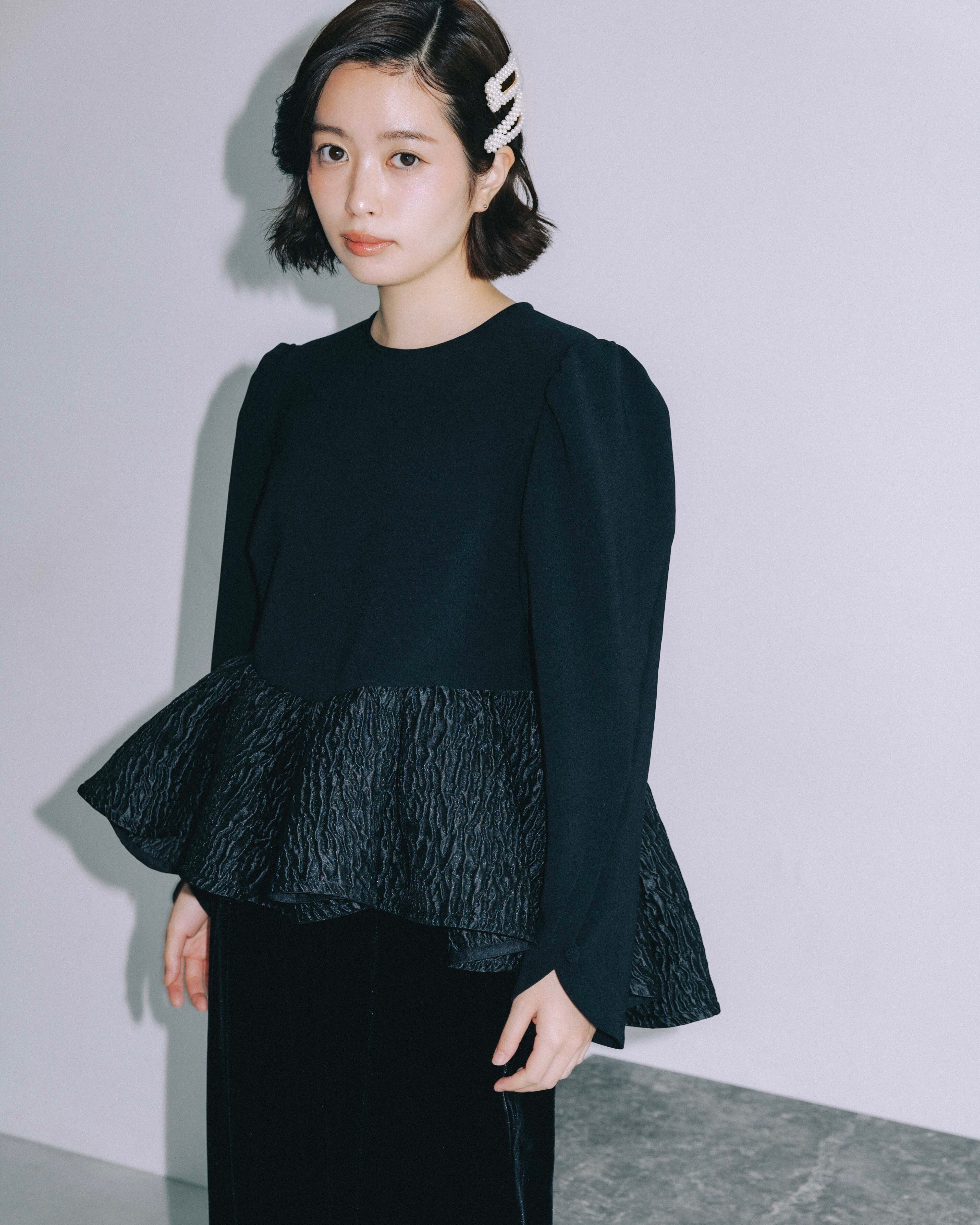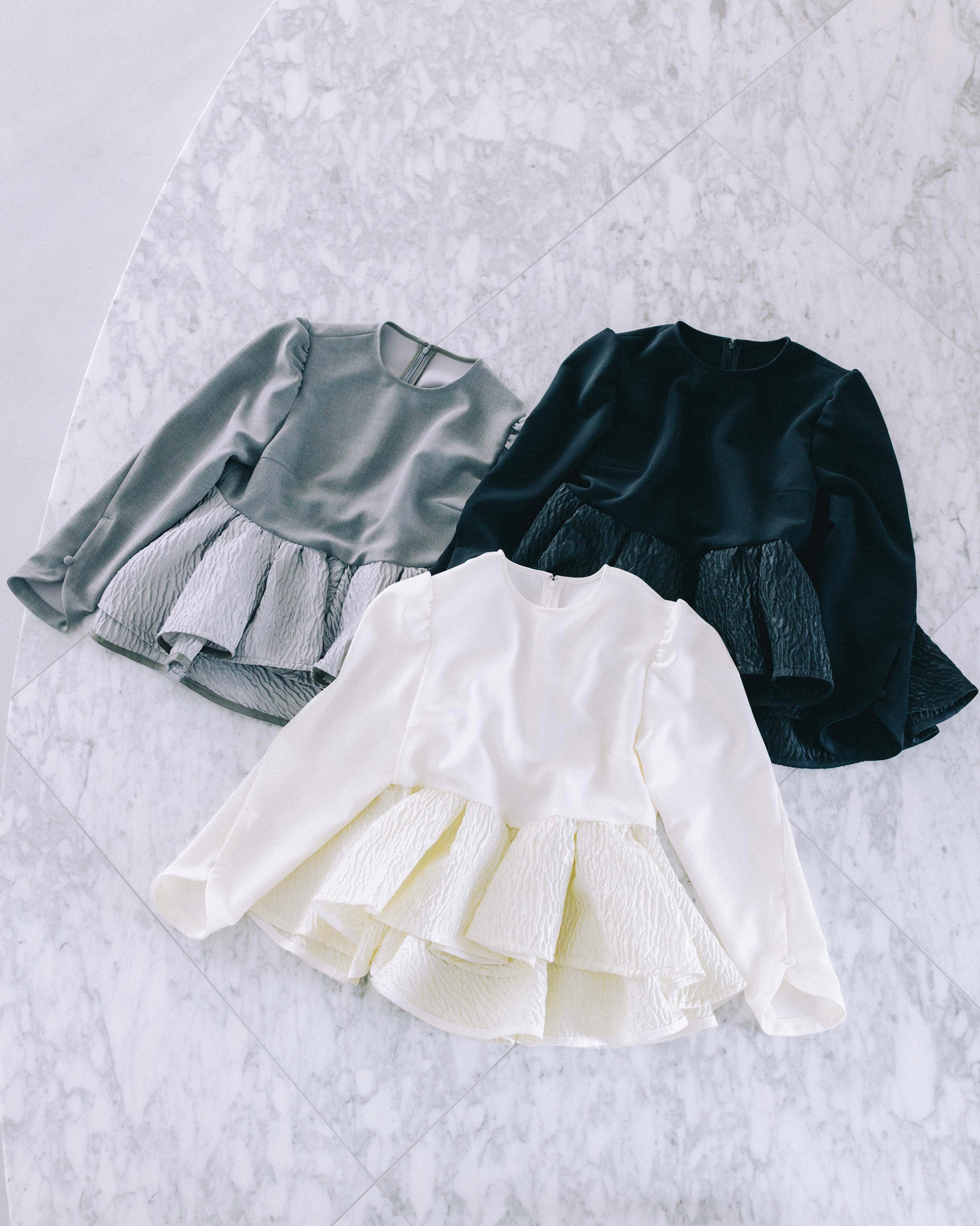 袖は、名前の由来となったカラー(Calla lily)のお花のように優しく包み込むような立体的なシルエット。裾の切り替え部分には、たっぷりとジャガード素材を使用し、エレガントなデザインに仕上げました。身頃の生地はマットでパウダリーな質感で、膨らみとストレッチ性も兼ね備えています。
